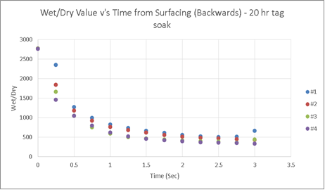 For completeness the typical response time for a ‘contaminated’ tag (i.e. one which has been soaked in seawater and accumulated a level of bio-film), is as follows: